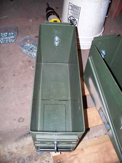 -Munición puede: Buscar uno que se adapta a todos sus componentes. La mía es una lata de municiones 40 mm largo bajo. 17 "x 6,5" x 10,5 "