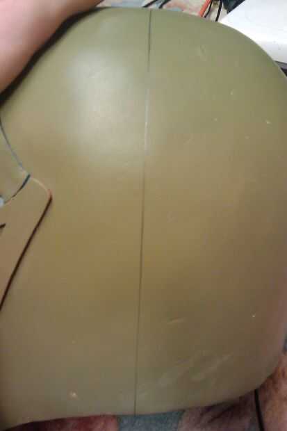 Quería un casco de dos piezas como los utilizados en el espectáculo así que dibujé una línea por la mitad con un lápiz que corta el casco por la mitad con una dremel.