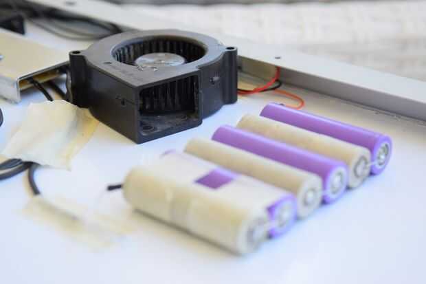 Baterías de litio son sensibles al calor, exposición a calor extremo puede causar explosiones. El panel solar, cuando se expone bajo luz del sol, podría calentamiento hasta + 100 ° C. Mi solución para esto también se agrega un ventilador de caracol enorme 12v para enfriar la superficie donde las baterías se montan sobre. El ventilador está conectado directamente con el panel solar. El ventilador se encenderá cada vez que el panel solar produce electricidad de la luz solar. Hay ninguna necesidad de sensores de temperatura, estoy en contra nocivo prototipos.