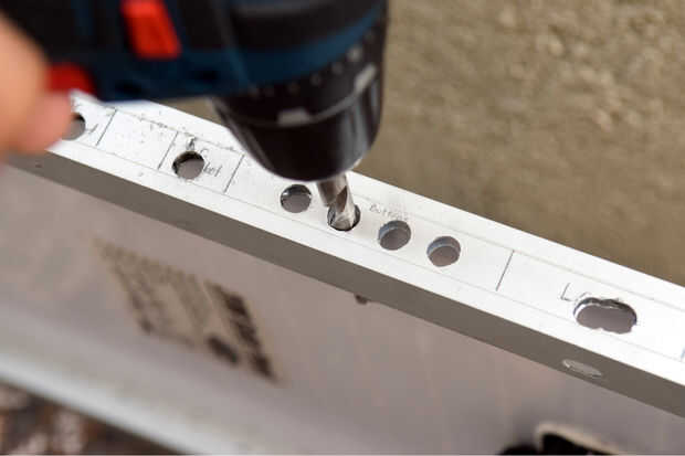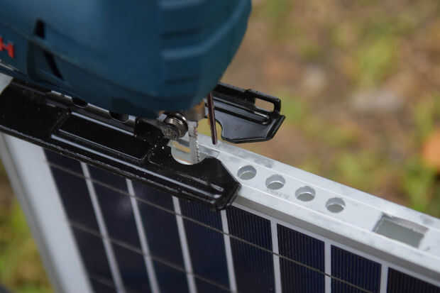 Probablemente usted se está preguntando cómo se supone cortar el marco de aluminio. La respuesta: podría usar su taladro eléctrico y Sierra de calar. En primer lugar, perfore un agujero para los botones y un agujero en el centro de las marcas rectangulares. Siguiente, rompecabezas de utilizarlos para acabar con el metal restante de las marcas rectangulares. Si tienes acceso a una sierra de calar, se puede utilizar una sierra de mano o puede utilizar una herramienta giratoria.