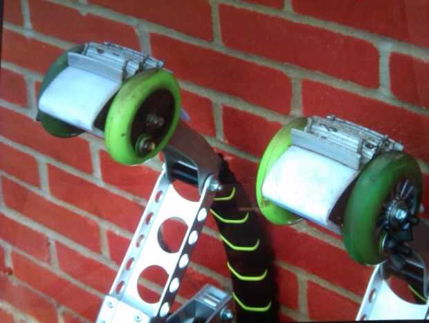 Aquí están los cascos viejos mostrando el camino de unidades y como las ruedas verdes no giren pero sirven como peldaños del camino que pueden activarse cuando la goma se desgasta en el área usted está caminando en.