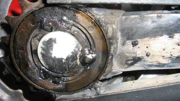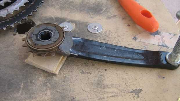 Usé el epoxi porque así cuando voy a la soldadora no desalinear mis bielas, lo que hizo fue poner un pedazo de metal entre el brazo de la biela y el exterior de la rueda libre de una soldadura del centro del brazo de la biela al interior de la rueda libre. Acusó de me $4,00 para eso.
