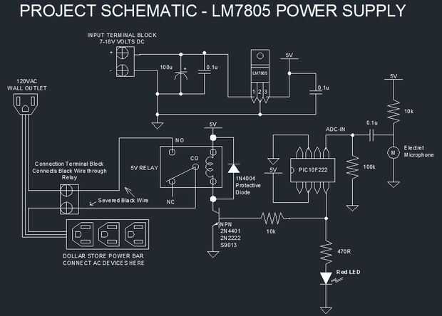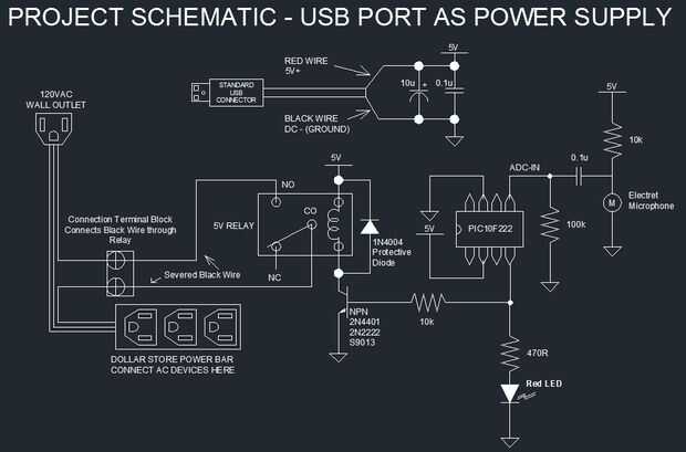 Obviamente no podemos conducimos AC con nuestra piddly poco USB fuente de alimentación 5V, así que vamos a tener que utilizar un relé para encender la fuente de alimentación de 120 VCA. Este relé SPDT (un polo doble tiro) de 5v sencilla requiere 5v a lo largo de la bobina para activar el circuito. Si no sabes mucho acerca de relés, sugiero leer más sobre ellos en línea. Sin embargo, voy a salir en un poco de detalle aquí. La salida del PIC no puede apoyar la corriente suficiente para conducir el Relais. Necesitamos usar un transistor para el relé por hundimiento alimentación directamente desde la línea de alimentación 5v. El PIC conduce el transistor, que acciona el relé. El PIC envía una señal positiva (5v) a la base del transistor de NPN para encender el transistor. Hay una resistencia protectora de 10 k entre el PIC y la base del transistor. Cuando se aplica alimentación a la base del transistor, energía en el colector se hunde a través de al emisor, que esté conectado a tierra. El colector está conectado a uno de los pines de la bobina en el relé. El otro pasador de bobina el relé está conectado a la fuente de alimentación de 5v. Cuando el transistor se enciende, energía está conectada a la bobina a través del transistor, y crea un campo magnético que actúa para conectar el contacto común del relé al pin NO (normalmente abierto). Por defecto, el pin común está conectado al pin de NC (normalmente cerrado). Hay un diodo protector que debe ser conectado entre la fuente de 5v y el colector del transistor. El cátodo más ser conectado a la fuente de 5v, y el ánodo debe conectarse con el colector del transistor. Si invierte esto, vas a soplar su fuente cuando el relé se enciende. También vas a dañar potencialmente su transistor NPN de pequeña señal. NO INVIERTA! Cuando se desactiva el relé, el campo magnético a lo largo de la bobina colapsa y se crea un pico de voltaje grande. Este punto se suprime por el diodo. IT debe colocarse con el fin de proteger su transistor y su fuente de alimentación, que es su puerto USB.