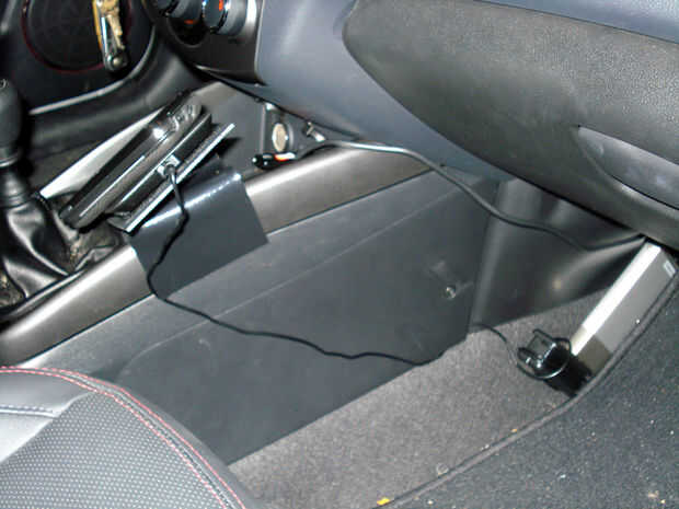 El cargador que he elegido es muy delgado, así que decidí esconder bajo los pies del pasajero bien. Cabe muy bien al lado de la estera que mantiene en su lugar. Entonces metido el cable adicional para reducir la holgura. Podría incluso tengo un plan para ese puerto usb extra en el convertidor.