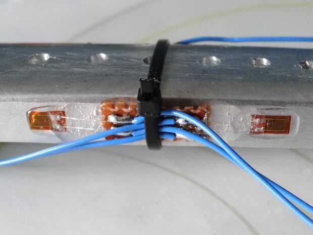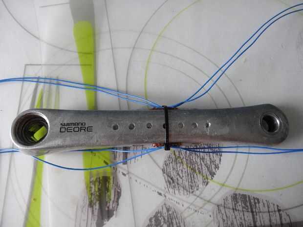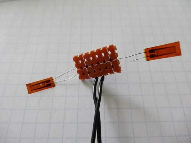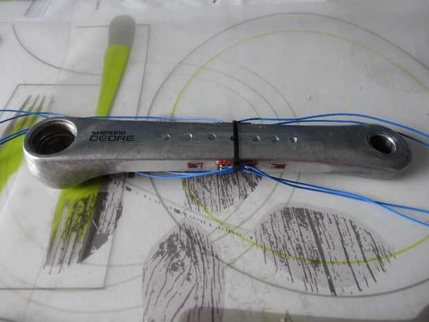 Para calcular la potencia, tenemos que determinar la fuerza actual, que transcurre por el pie en el pedal. Para ello clued cuatro galgas extensométricas (http://www.ebay.com/itm/5Pcs-Pressure-Sensor-Precision-BF350-3AA-BF350-350-Strain-Gauge-Resistance-/361278029289?hash=item541dd93de9:g:oOYAAOSwstxVOFv2) en los lados de mi manivela antigua. Para obtener una señal dependiendo de la carga les arreglé en un así llamado puente de Wheatstone.