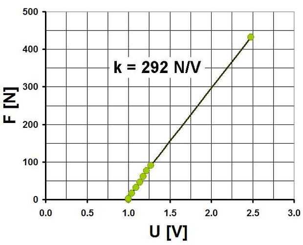 Conocer la proporcionalidad entre la fuerza F y la tensión de salida U filtró la manivela con diferentes masas y yo (un montón de masa ;-)). La subida de la línea es en mi caso 292 Newton/voltios.