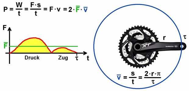 Durante una rotación completa me suma tantas fuerzas como sea posible y calcular el promedio. Combinado con la velocidad media (2 * Pi * radio de manivela / tiempo de rotación) obtengo la potencia P.
