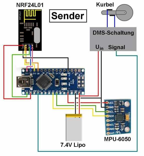 Para ahorrar espacio, que usar un arduino nano y el NRF24L01 son responsables de la comunicación. Gran trabajan y puede enviar tantos valores como queramos. En mi caso envío la potencia (P) y las rondas por minuto (rpm).