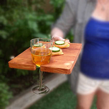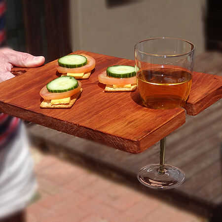 Este plato de aperitivos práctico está diseñado para sostener una copa de vino y es perfecto para tiempo de barbacoa para el entretenimiento o para eventos especiales. Hemos hecho nuestro de un pedazo de chatarra laminada de pino, pero usted puede elegir cualquier tipo de madera para hacer su propio plato de aperitivo.