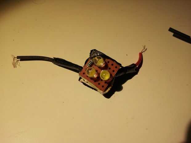 Las luces sacó a la luz incandescente de mi linterna y lo reemplazó con 3 LEDs blancos. Ya se llevó la luz trasera, pero con pilas, por lo que sólo cableado lo con una resistencia extra para evitar comer alimentación demasiado rápido en las paradas, dando preferencia a la linterna. Si tienes una linterna led o luz trasera, se pueden utilizar como-es, solo cable hasta los bornes de la batería.