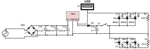 Se puede ver que la fuente de alimentación de CA en el lado izquierdo está conectada a un puente de diodos. Esto efectivamente convierte la CA de la dinamo a DC, que pueden utilizar LEDs y baterías.