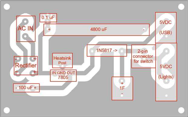 A continuación hay unos condensadores 0.1 uF y 100 uF, suavizar la tensión de la dinamo, que es bastante ruidosa. Esto le ayudará a introducir una tensión relativamente constante en el regulador de tensión 7805.