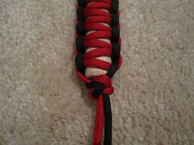 Ate otro nudo de diamante en el extremo de la madera. Usted tendrá que trabajar el nudo, tirando poco a poco el paracord a través del nudo para conseguir el nudo firmemente alojado contra el extremo de la madera.