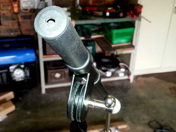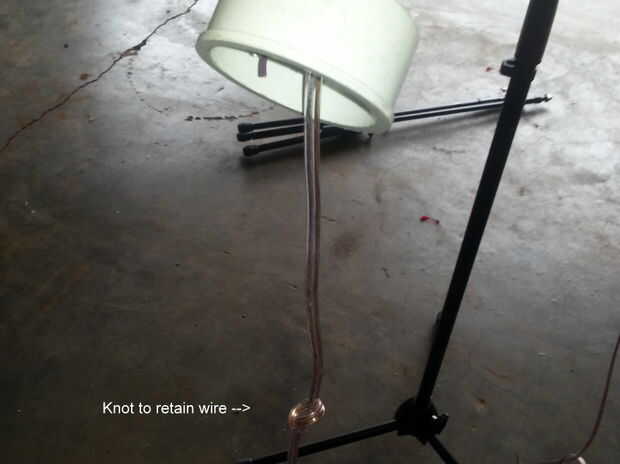 En el otro lado del brazo de micrófono, perforé un agujero de 5mm para el alambre. Me encontré un trozo de alambre de doble flex a través del brazo del micrófono. Para asegurar que uno no tira el cableado desde el soporte de la batería, he hecho un nudo en el cable de donde saldrá el brazo. Retirar los cables de la luz y soldar el conector en el cable que sale el brazo del micrófono.