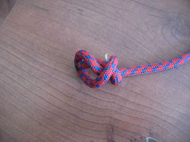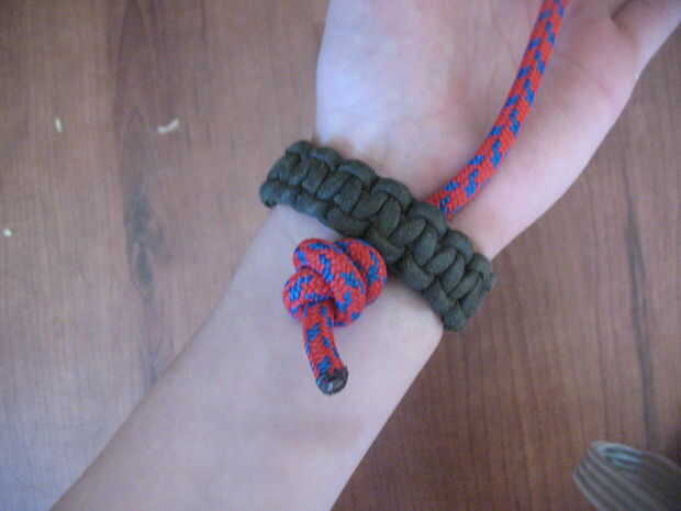 En el otro extremo de la cuerda, nudo otro doble tapón por todo lo alto se deslice debajo de la pulsera.  Por otra parte, ate un as de guía para ir alrededor de su muñeca débil.  Yo prefiero el método de la pulsera.