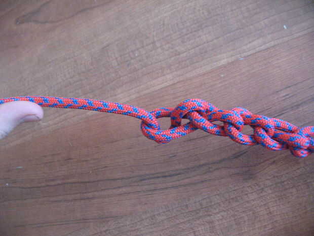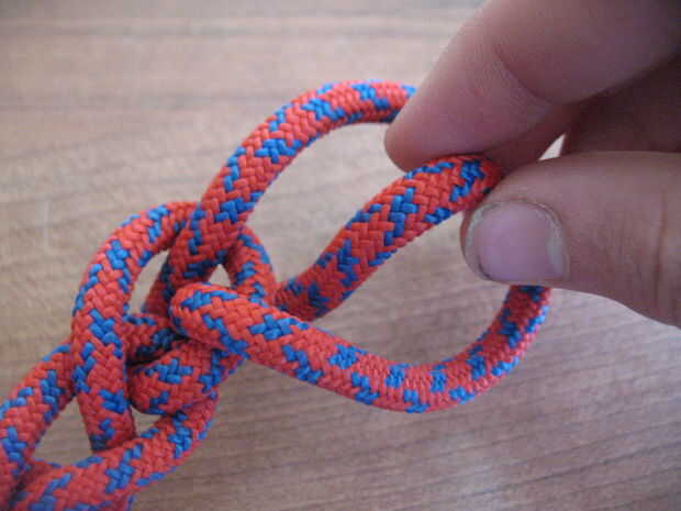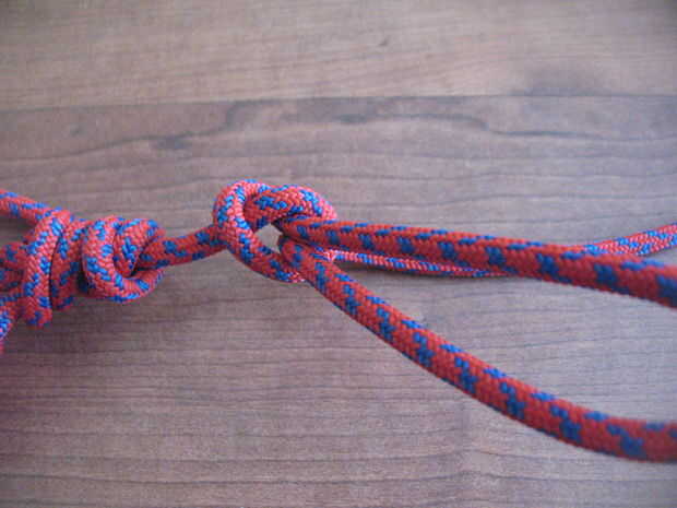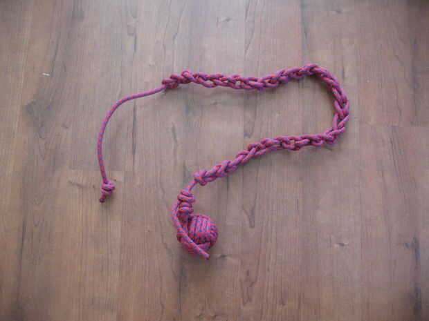 Hacer un nudo de cadena de mono en la cuerda, empezando por la cabeza del meteoro.  Para aquellos que no saben cómo hacerlo, siga las fotos.  Al llegar al final de la cuerda, meter la cuerda extra a través del último lazo.  Para deshacer, tirar de la cuerda a través del lazo y tire hasta que quede completamente revelado.