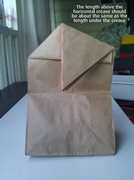 El punto del triángulo derecho y doble hacia abajo. Lo que quiere es que la longitud de la arista por encima del pliegue horizontal aproximadamente igual a la longitud de la arista por debajo del pliegue horizontal. La razón de esto es que la parte que cuelga bajo el pliegue horizontal será recogida debajo del asa, y la punta de la caída del exceso descansará exactamente bajo el punto del mango cuando esté listo, para un doble seguro que es fácil de mantener.