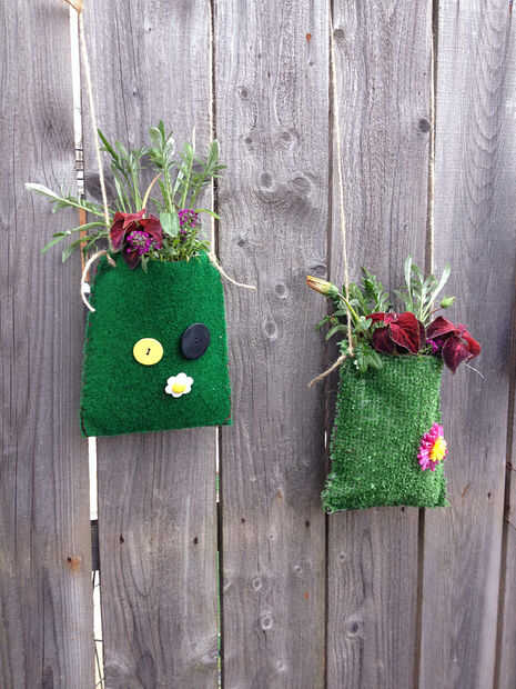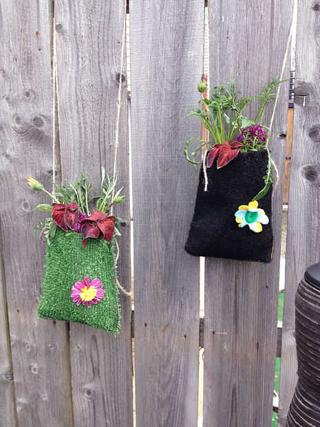 Llenar las bolsas con suelo de rellenado, plantar un par de plantas con flores poco dulce en ellas y colgar por la guita. Un gran proyecto si han limitado espacio al aire libre!