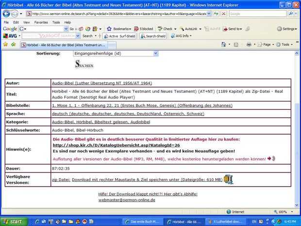 Cuando traté de descargar toda la Biblia alemán en este sitio, la velocidad de subida era bastante lenta. Mi hija tiene un ordenador siempre en una conexión de alta velocidad. Ella lo descargaron para mí durante dos noches. Si desea una copia, mandame un mensaje privado y vemos lo que podemos resolver por lo que ninguno de nosotros está demasiado cargado financieramente.