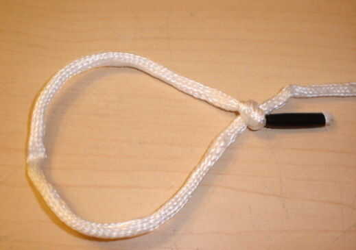 Un nudo deslizante en un extremo de la cuerda. Asegúrese de que se deslice fácilmente sobre su mano no dominante ("mano débil") en la muñeca, pero no es demasiado apretado. Dejar aproximadamente 2 pulgadas (2,5 cm) del extremo suelto. Envuelva el extremo suelto con una longitud corta de cinta aislante de plástico.