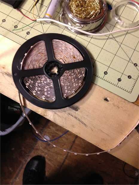Las armas de juguete usadas vinieron con láser construido en, otro hubiera tenido que conectarlos. Hacen mucho ruido, por lo que no estaba seguro de conectar el sonido al objetivo podría funcionar sin un sistema de altavoces. Por lo tanto, me decidí por las luces y el movimiento para que los niños sepan cuando golpean a un gestor de micro en el punto "dulce". Tiró de una cadena de tres pies de LEDs y strunk a lo largo de la parte superior.