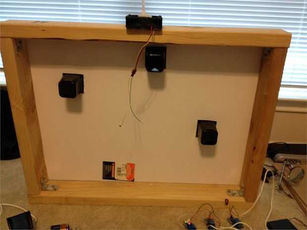 Arduino + 2 servos + láserEnciéndalo y los servos moverse a una posición aleatoria y vuelta sobre el objetivo del láser. Tienes 2 segundos para golpear antes de que se apaga y se mueve a una nueva posición al azar. Posiciones del servo se limitan a 0