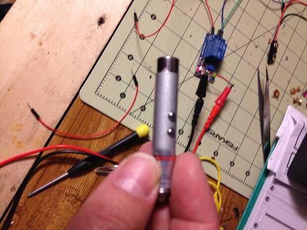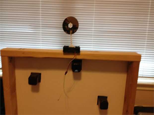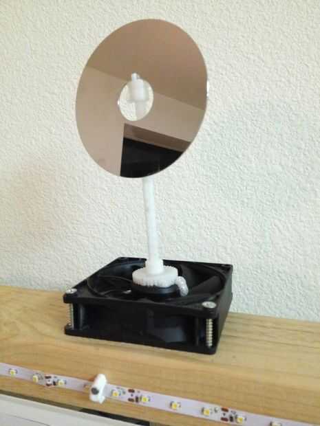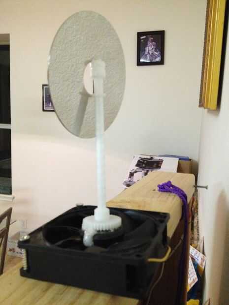 Necesitaba algún movimiento que ocurra cada vez que el láser golpee el sensor, así que me decidí por una menos espectacular, pero barato y efectivo ventilador de una PC vieja. Es 24V, pero corrió a una velocidad decente en 18V. Utilizaba un engranaje de un viejo destrozado impresora (fue después de que el paso a paso motores en él) y el disco de un disco duro roto. Usé un viejo puntero láser hacia el disco mientras gira para dar un efecto de luz. Los 9 años pensaba que era lo suficientemente fría pero no tarda demasiado para impresionarlos.