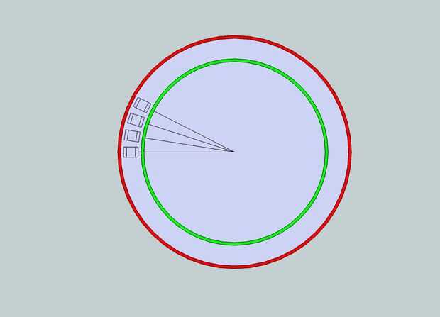 Para obtener una buena distribución de luz dividí el anillo en 40 segmentos dejando cada uno llevó con mucho espacio por lo que puedo meter alrededor de él con mi soldador. Esto da un LED cada 9 grados.