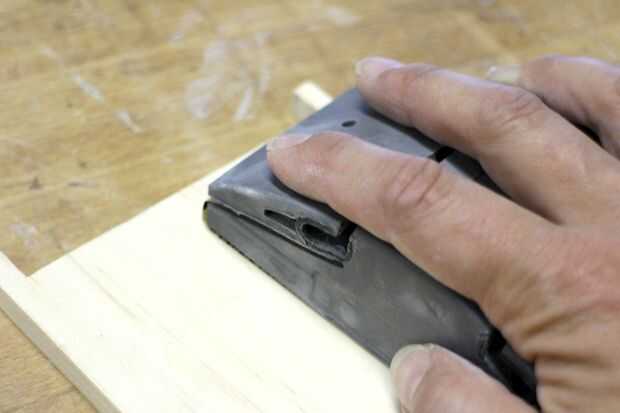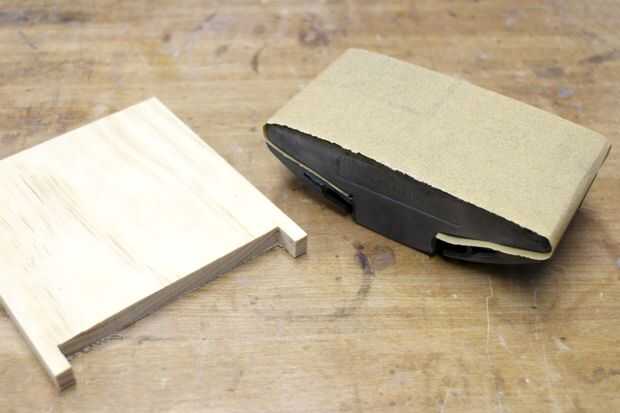 Usando papel de lija de grano 220 y una lijadora de bloque de mano, suavizar y arena todos los lados y superficies de la montaña.