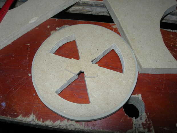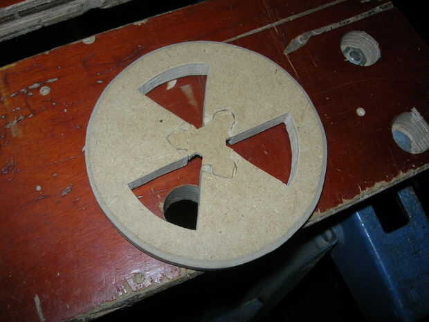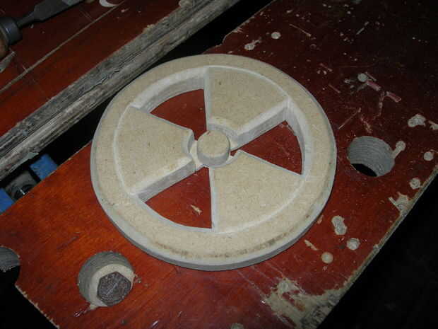 • Primero, usted necesitará hacer tres muescas (3 mm de profundidad) en el símbolo de nuke con el router de penetración (con una broca recta). Las marcas de lápiz se hace servir como una guía aquí.