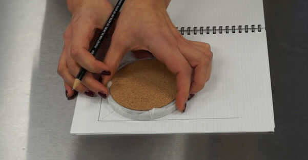 Para grabar correctamente nuestros iconos en el centro de nuestros posavasos tenemos que encontrar el centro. Puede medir el diámetro con dos líneas perpendiculares y ver donde se cruzan, o como te mostramos en el vídeo - dibujo un ángulo recto en un pedazo de papel y colocando la montaña contra las dos líneas. Luego marque en el papel de embalaje donde la montaña toca la línea, girar la montaña 180 grados y hacer el mismo proceso, entonces conecte las dos líneas usando un trozo de borde recto.