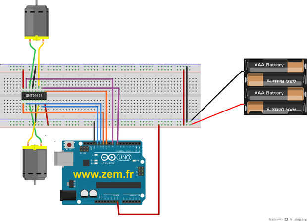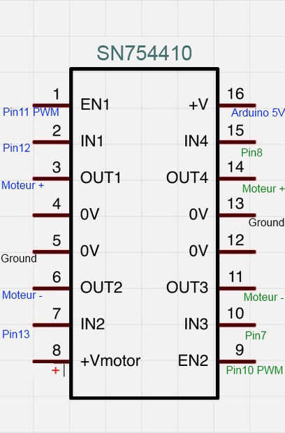 Le mouvement des pattes est effectué à l'aide de quatre moteur CC. Afin de permettre le changement du sens de rotación des moteurs, por utilizar des circuitos intégrés SN754410 de tipo puente en H. Deux SN754410 sont necesitan puisqu'il n ' est d'y posible conector deux moteurs. Le shéma affiché est donc à reproduire deux fois.