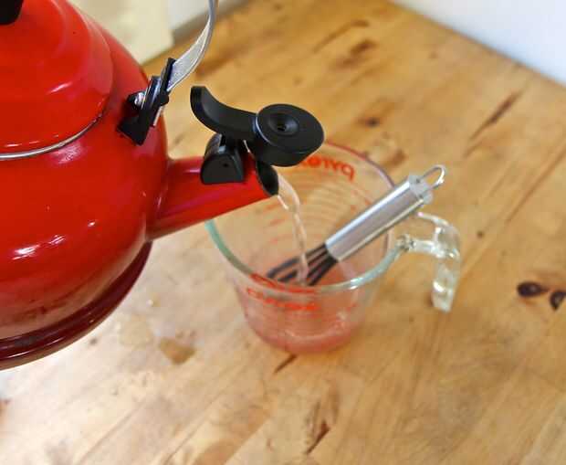 Una vez la gelatina ha florecido y espesado, añadir 1/4 de taza de agua hirviendo. Mezclar con el batidor hasta que se disuelva completamente y uniformemente su gelatina florecido.