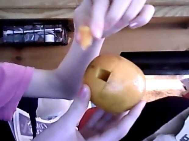 Corte un cuadrado pequeño de color naranja. A continuación, deslice un jellybean naranja en el orificio. Corte carne y vuelva a colocar la corteza. Es así de simple.