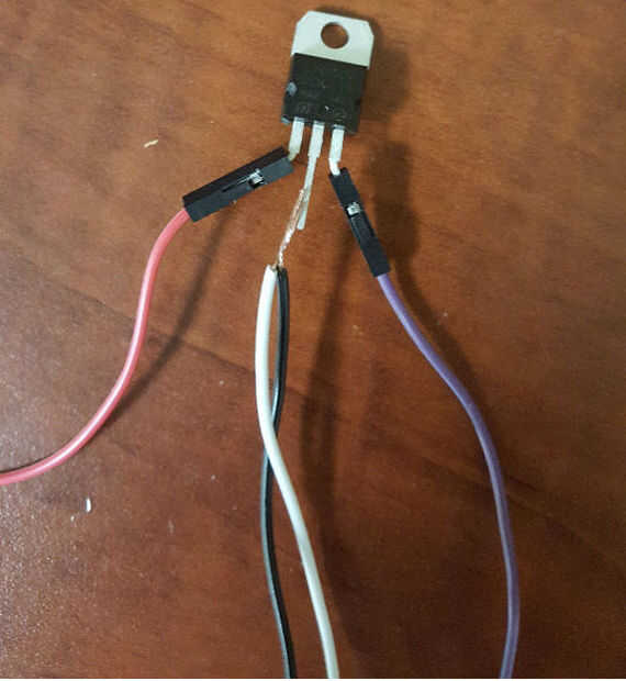 A continuación enchufe un extremo del positivo en la izquierda pin la mayoría de la fuente de alimentación de PlayStation (cable rojo en la imagen). Luego tomar el otro extremo de ese alambre positivo y empuje en el extremo izquierdo del regulador.