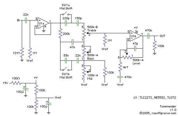 Luego me prestas el tonestack de la Tonemender que se encuentra en www.runoffgroove.com . El Tonemender es un booster con un tonestack muy flexible, que puede volver a crear las respuestas Fender, Marshall y Vox.