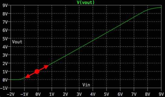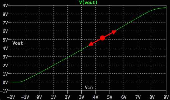 Tenga en cuenta que cuando Vin = 0V, Vout = 1V, lo que indica que hay flujo de corriente a través de R1. Vout va a 0V cuando Vin es alrededor de - 1.25V, que es el punto donde se apaga el JFET. En el rango entre Vin = - 1.25V y Vin = 7.5V, Vout aumenta linealmente con Vin. De hecho, por cada incremento de 1V de Vin, Vout también aumenta 1V. La relación entre el cambio en Vout sobre el cambio en Vin (la pendiente de la recta) es la ganancia del amplificador, que en este caso es exactamente igual a 1.