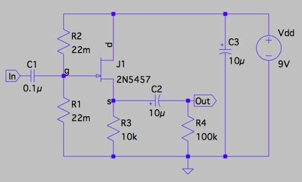 Como acabamos de ver, aumentando el voltaje promedio de la señal de entrada donde golpea la puerta de lo JFET puede ser una buena cosa para que el JFET puede funcionar en una distorsión-libre "zona segura". La tensión media como el cambio se denomina agregando un sesgo DC a la señal. S mala forma, sin embargo, para pasar una señal con un sesgo de DC cero a otro componente, como un pedal o amplificador aguas abajo. Acoplamiento de condensadores en serie con la entrada y salida de un Quite de circuito cualquier sesgo DC de una señal entrante y saliente. Ese es el propósito de la entrada del condensador C1 y C2 del condensador de acoplamiento de salida de acoplamiento. Puesto que un piezoeléctrico tiene una capacitancia de serie en su salida, C1 probablemente no es necesario en este caso, pero la mayoría diseños de preamplificador incluyen y no duele. Si el JFET era imparciales para operar alrededor de 0V dejando a R2, C2 también puede ser opcional. Sin embargo, que una vez tuvo un caso donde un pedal de volumen produce ruido en un componente de audio que estaba antes de él en la cadena de efectos y poner un condensador de 10uF acoplamiento entre ellos resolver el problema, por lo que es mejor dejar C2 allí. R2 también ayuda a asegurar que la salida es parcial alrededor de tierra.