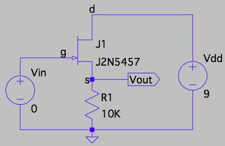 Un JFET tiene 3 terminales, llamados la puerta (g), drenaje (d) y fuente (s). En general, aumentando la tensión Vin en la puerta de lo JFET provoca un aumento en la corriente que fluye a través del dispositivo del drenaje a la fuente. Que en ningún otro lugar para ir, la corriente fluye a través de la resistencia R1, de la fuente que a su vez produce un voltaje a través de R1 (recuerde la ley de Ohm, V = IR), causando la tensión de salida Vout a aumentar también. Una de las cosas inusuales de un JFET es que si el voltaje de entrada es 0, lo que significa que la entrada está conectada a tierra, existe una corriente que fluirá de drenaje a fuente, y que realmente se necesita aplicar un voltaje negativo a la puerta para apagar el dispositivo. El diagrama siguiente muestra la relación entre la tensión de entrada Vin y el voltaje de salida Vout, dado un voltaje de alimentación Vdd = 9V y una resistencia de fuente de 10 k ohmios.