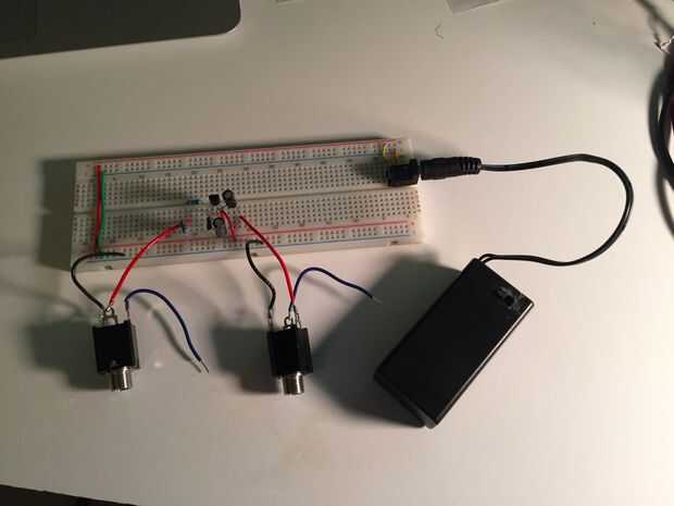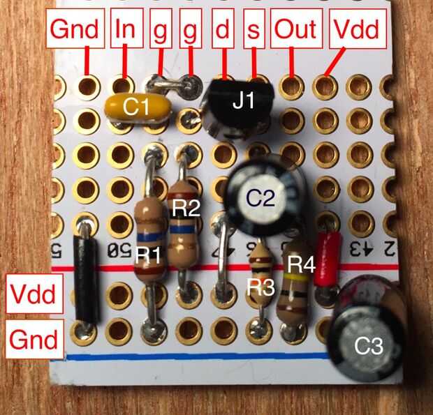 La foto de arriba muestra la disposición de circuito detallados en la versión soldada de la protoboard de Proto de Adafruit. Cada una de las tiras verticales están marcados con los nombres de nodo del circuito del esquema y las tiras horizontales de fondo son Vdd y franjas verticales GND. Nota que dos se dedican al nodo de puerta JFET (g), atado por un pequeño puente de alambre. También tenga en cuenta que la tira vertical de la izquierda está ligada a la tierra y la derecha a Vdd, para proporcionar más agujeros para conectar las tomas de teléfono y el clip de batería. Al conectar los condensadores electrolíticos C2 y C3, preste atención a qué lado es (+) y (-). El cable más largo es el (+) terminal.