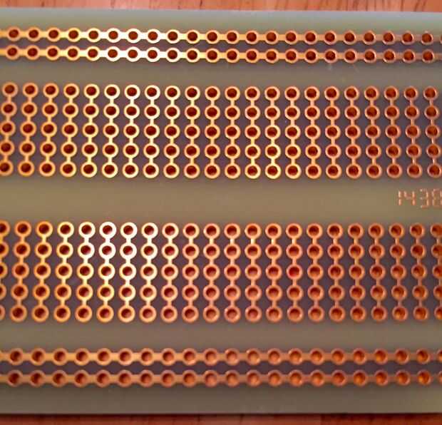 Antes de soldar cualquier circuito, es buena probar en un protoboard para asegurarse de que funciona. Este es también el tiempo de prueba diferentes opciones, como diferentes JFETs o ver si el circuito alrededor de un punto de funcionamiento de 0V o 4.5V de polarización eliminando o incluyendo R! hace la diferencia. Una vez que tienes la configuración de circuito que quieras y funciona, usted puede soldar a un protoboard. Hay muchos estilos de tablero diferentes para elegir, pero me gusta especialmente los donde los agujeros están conectados por las tiras de metal en la parte posterior de la misma forma exacta como un protoboard, con agujeros en medio de la Junta en franjas verticales y los agujeros a lo largo de los bordes superior e inferior en tiras horizontales de alimentación y tierra. La mayor ventaja de estos es que no tienes que mantener a los bancos la Junta para ver lo que se conecta a lo que se suelda, ya que sólo se puede transferir su trazado de circuito de la protoboard. Un número de empresas hace este tipo de tablero, pero los de Adafruit son especialmente buenos. I ordenar los de tamaño completo y luego cortado a la medida según sea necesario con tijeras. Para montar la placa de circuito en el caso de la lata junto con los conectores de la batería y el teléfono, la Junta no debe ser amplia de más de 10 agujeros.