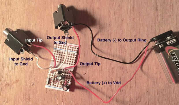La figura superior muestra el cableado a los conectores y clip de la batería. Los terminales de punta de los dos gatos de ir a la y conexiones en el tablero. Ambos terminales de pantalla van a la tierra. (+) Terminal del clip de la batería va a Vdd en la Junta. Ahora aquí está el giro: la terminal (-) del clip de la batería va al terminal de anillo de la toma de salida. Si no hay enchufe en el conector, luego se desconecta la batería, pero si se inserta un enchufe, ya que el enchufe realmente no tiene un contacto de anillo, el anillo terminal y extremo terminal del escudo que pone en cortocircuito juntos, conectando el terminal (-) de la batería a tierra. Este es un truco común para extender la duración de la batería de efectos de guitarra.