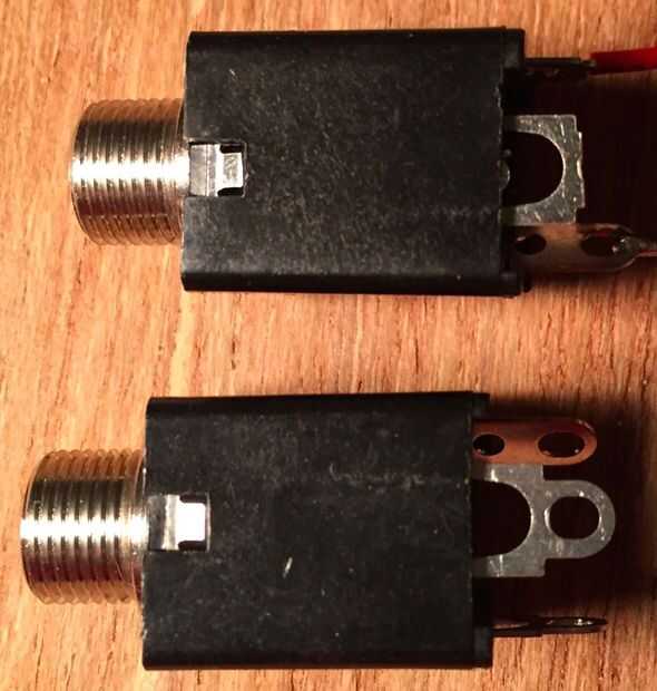 Conectar los jacks de 1/4" y el clip de la batería es sencillo, con un pequeño toque. A pesar de que el conector macho de un cable de guitarra tiene dos contactos, punta (T) que lleva la señal y el escudo (s) que es la tierra, estamos usando conectores hembra con tres terminales, punta (T), anillo (R) y escudo (S). La torcedura es que usaremos el terminal de anillo de la toma de salida para crear un interruptor para que la batería se desconecta cuando no se conecta a la salida.