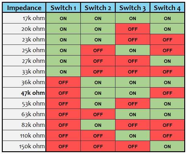 Los interruptores a la izquierda (con cuatro configuraciones de cada) establecerá la impedancia de entrada según la tabla anterior.