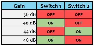La ganancia se establece mediante los interruptores a la derecha del tablero, con dos posiciones, según la tabla anterior.