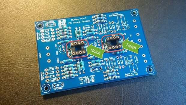 Los zócalos DIL (dual en línea) son el siguiente componentes en el PCB. Estos zócalos se utilizan para que los chips de amplificador (amplificadores operacionales) pueden reemplazarse si es necesario.