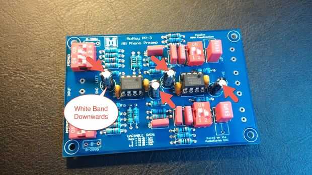 Estos cuatro condensadores (uF 10 o 22, dependiendo de lo que usted eligió cuando ordenar el kit) tiene que orientarse de la manera correcta. La banda blanca muestra la pata negativa y puntos hacia abajo de todos los cuatro condensadores.