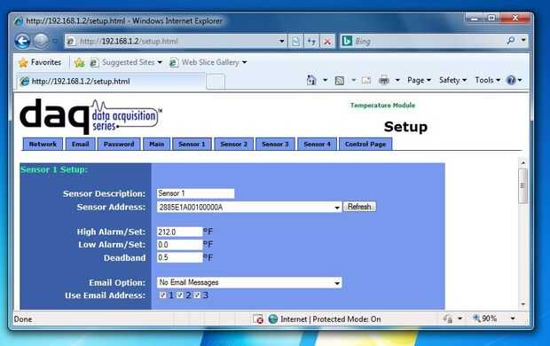 La última imagen de este paso, muestra la página cuando se selecciona la pestaña de "Sensor 1". En esta pantalla que se pueden establecer varias opciones, pero para este proyecto el elemento principal es digital ID. del sensor temperatura Cada uno de los sensores de temperatura de tres de este proyecto tienen identificadores únicos para que el módulo de temperatura deben estar configurado para saber que uno se comunica con.