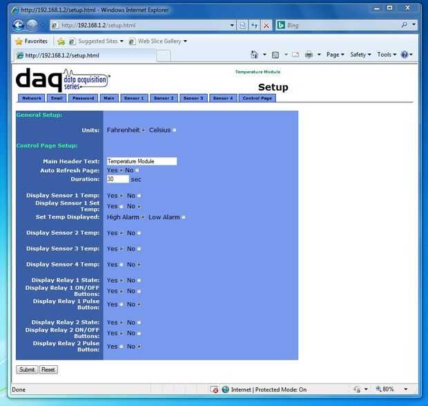 En la segunda imagen la configuración General se muestra página (encontrado en la pestaña 'General' de la página de configuración principal). Dentro de esta página de configuración de ajuste varios están definidos para este proyecto. Configurar el módulo de temperatura para mostrar los datos de los sensores 1-3. También puse los botones de control y estado de control de relés 1 y 2 que se muestra.