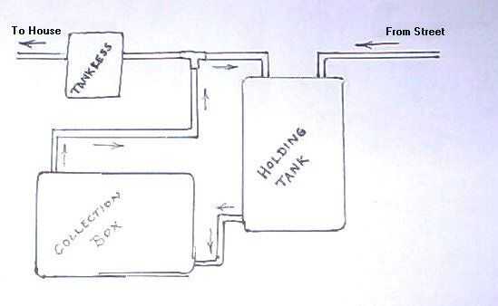 Cuando agua caliente se enciende en la casa, el agua es empujada a través del calentador sin tanque desde la parte superior del depósito de y desde la parte inferior a través de la caja de colección. No importa. El agua que recibe el calentador sin tanque será mucho más caliente que si vino directamente desde la calle.
